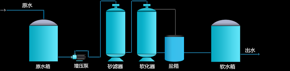 井水或者自來水→原水箱→石英砂過濾器→軟化水過濾器→軟水箱→用水點