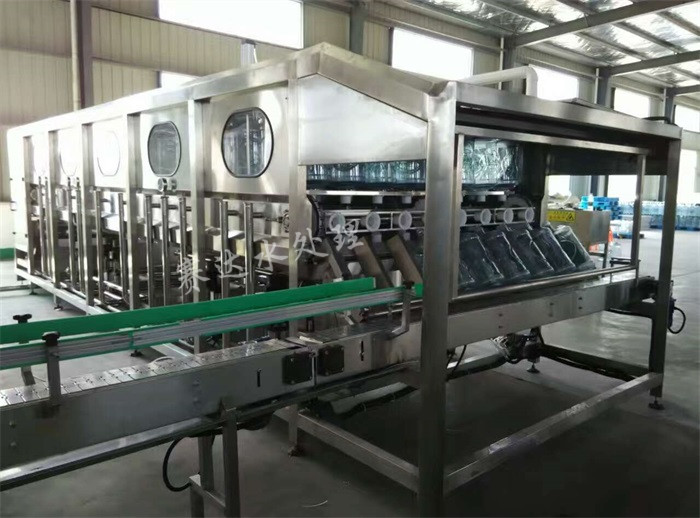 桶裝水灌裝機集消毒、沖洗、灌裝、封蓋于一體,其沖洗工位為:一道瀝干、兩道熱堿液噴洗、一道滴干、兩道自來水噴洗、兩道回用水噴洗、一道滴干四道消毒液噴洗、一道滴干、兩道成品水噴洗、一道滴干(沖洗工位可以根據(jù)客戶需求做14-20道),在此過程中,桶的外部也利用噴射頭進行了相應的噴洗,通過提升裝置,將所有噴射頭往上提升,深入空桶內(nèi)部,對桶內(nèi)部進行徹底的消毒、噴洗。通過自動下桶裝置將清洗后的空桶送入灌裝位置,并進行灌裝,過程中溢出的水將回流到純水箱,避免成品水的浪費。灌裝后的大桶由輸送鏈帶其依次進行掛蓋和封蓋。
